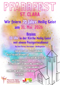 Aus diesem Anlass findet das Pfarrfest St. Clara am 31. Mai 2026 in Heilig Geist statt.